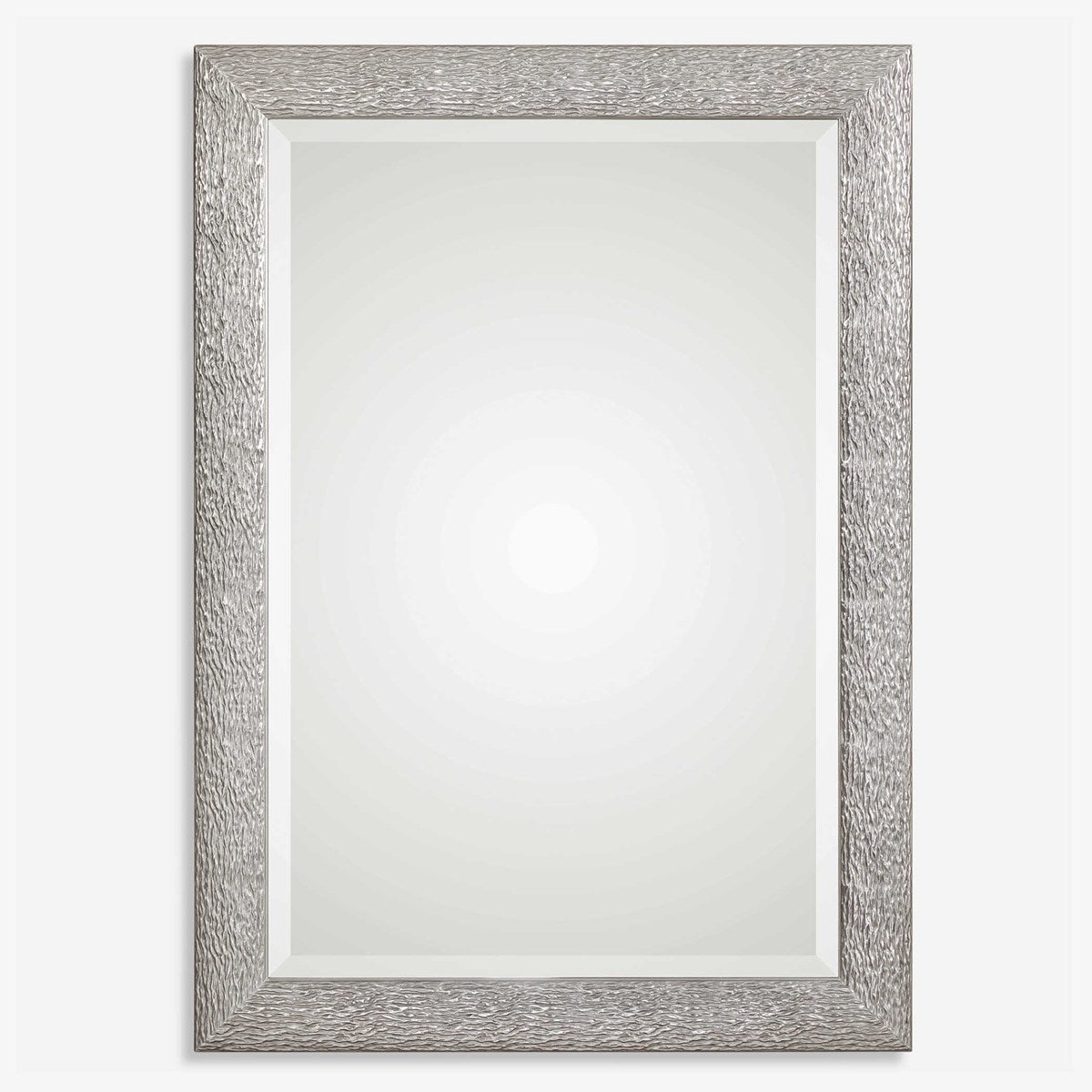 Solid Wood Frame Featuring An Embossed Wavy Texture, Finished In A Metallic Silver With A Light Gray Wash. Mirror Features A Generous 1 1/4" Bevel And May Be Hung Horizontal Or Vertical.