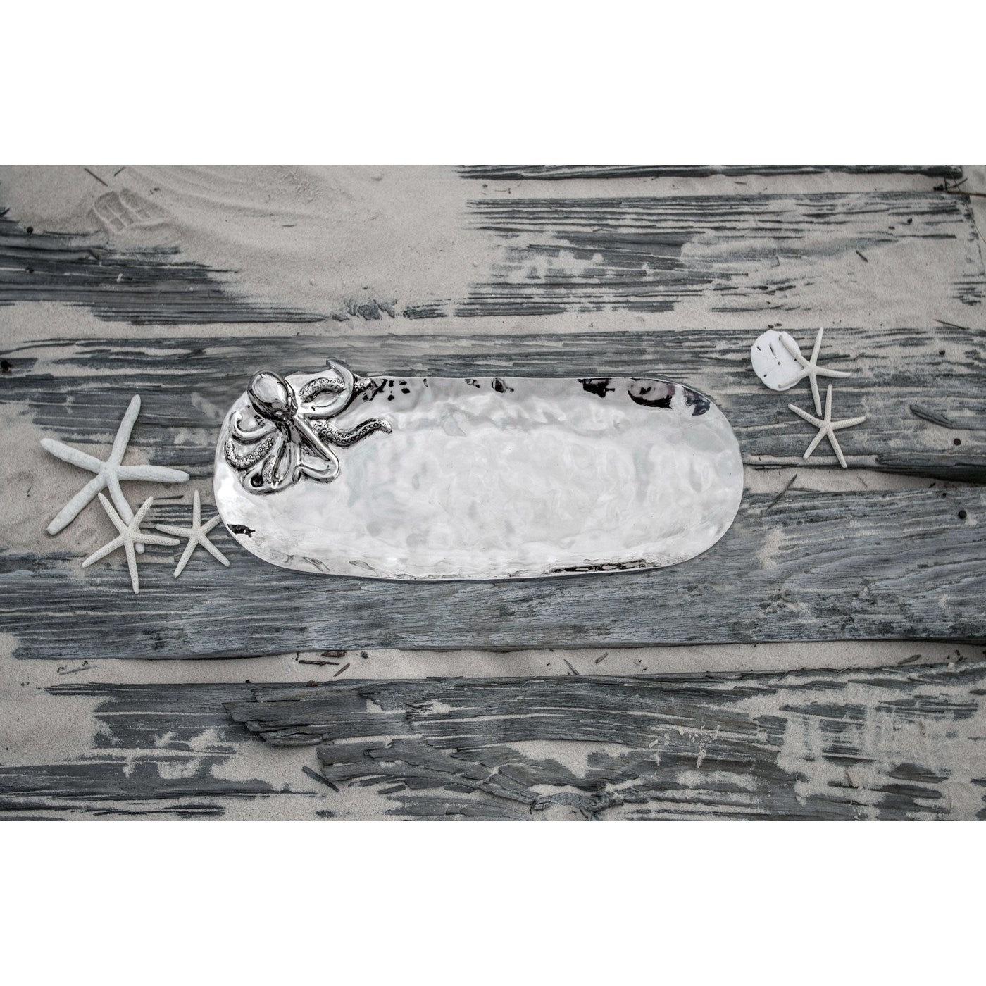 Inspired by one of Nature's curiosities, the Octopus Oval Tray offers an irresistible surface for serving your favorite cheeses, hors d'ouevres, and other little bites. Beautiful for a beach house, or your house. This sand-cast metal tray, goes from oven to table. Made of an FDA safe, easy-care, oven and freezer friendly aluminum alloy.