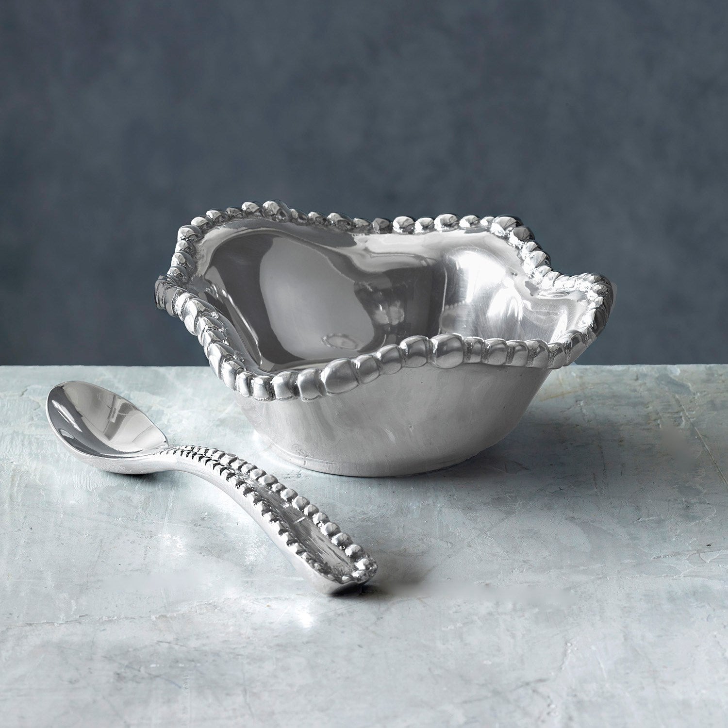 These Organic Pearl decorative silver bowl with serving spoon makes a unique wedding gift, and a beautiful accent piece. From our Giftable Collection; handmade and artfully designed items at irresistible prices. You'll love our exquisitely detailed GIFTABLES Petit Bowls with matching spoons. Perfect for serving sauces, chutney, jellies, and garnishes. Made of an FDA safe, easy-care, oven and freezer friendly aluminum alloy.
