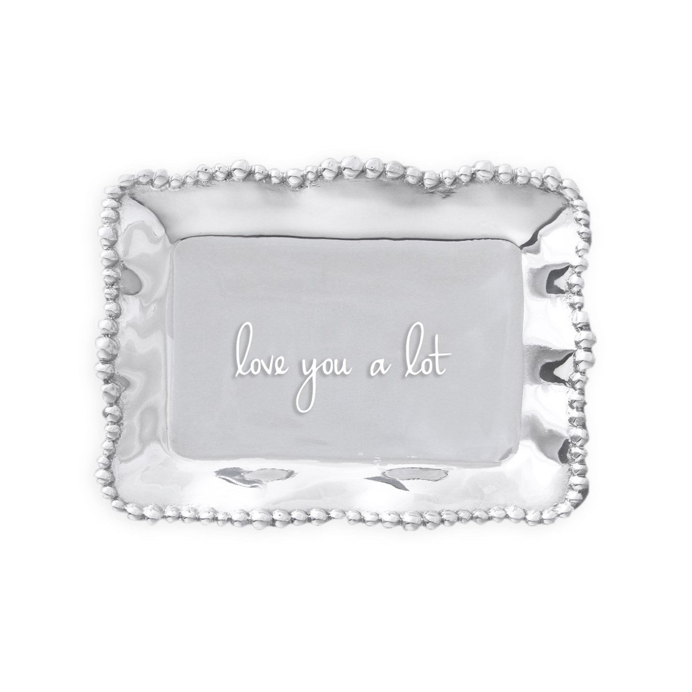 Share your love of that special someone with this delightful GIFTABLES Organic Pearl Rectangular Engraved Tray. Engraved with the slogan, "love you a lot," this delightful mini tray is distinguished by its rich, hand finished surface, and practical size. Perfect on the bar, or on a desk, bedside table, or coffee table as a decorative accent. An ideal hostess gift! Packaged in a lovely gift box, makes a lovely present for the Holidays, birthdays, anniversaries, and other occasions. Every gift makes a meaningful connection! Handmade of an FDA safe, easy-care, oven and freezer friendly aluminum alloy. Tarnish free.