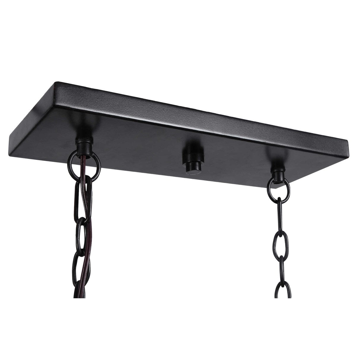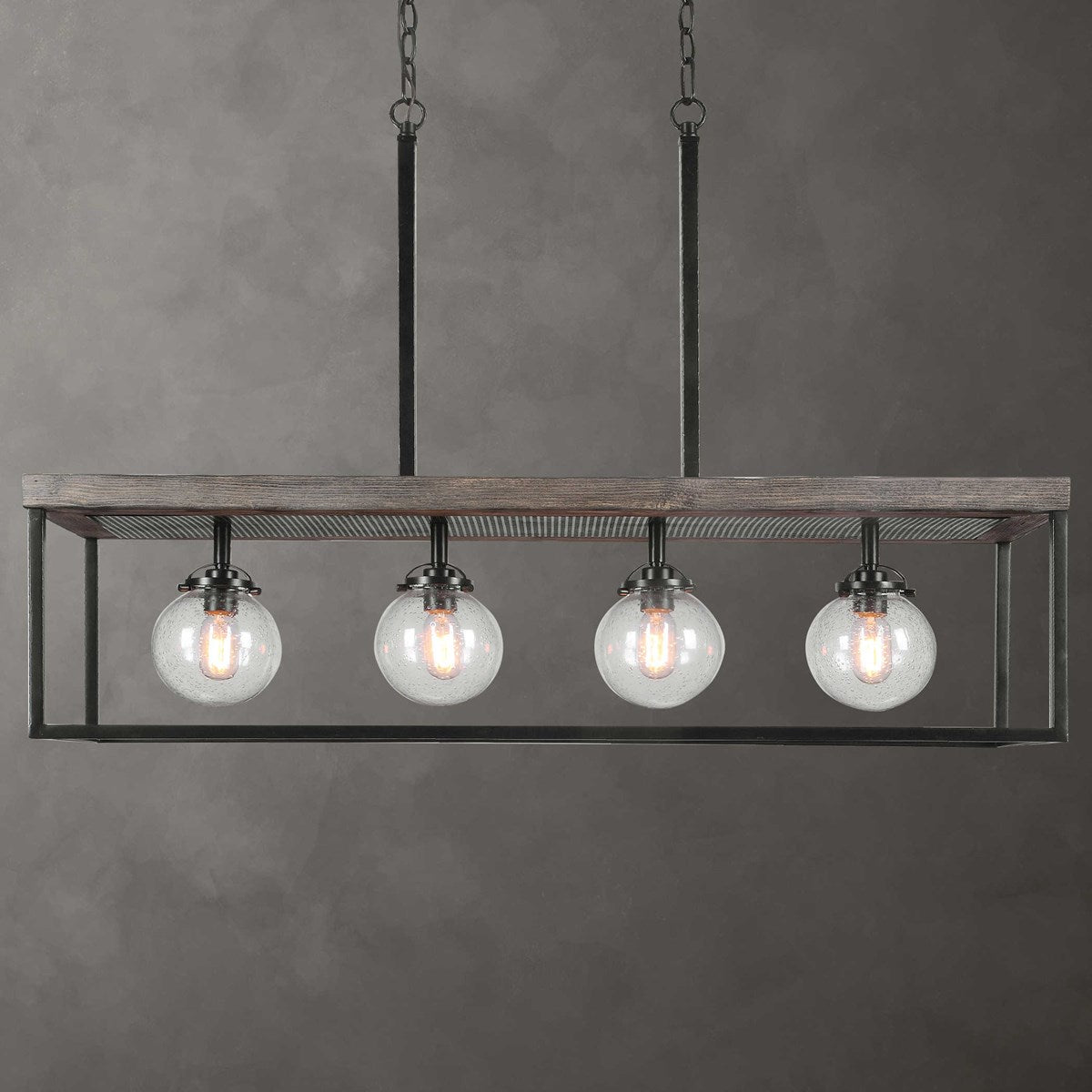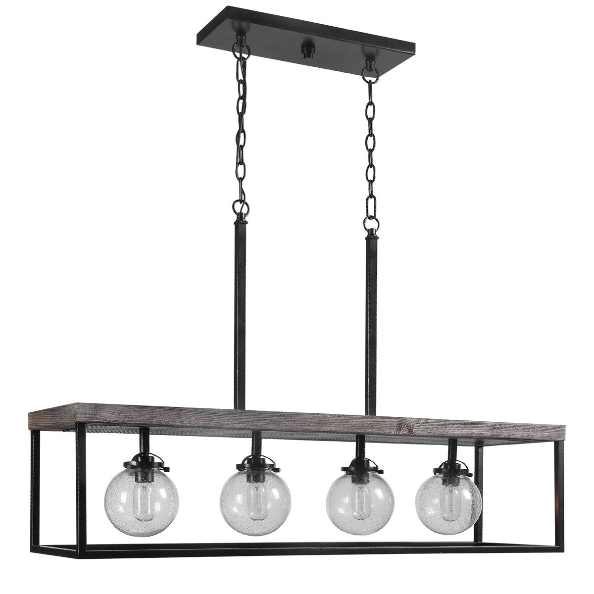 A Combination Of Both Refined Rustic And Industrial Elements Featuring A Textured Black Metal Finish With Distressed Wood Evoking A Medium Tone Walnut Form This 4 Lt. Island. The Clear Seeded Glass Globes And The Top Punched Metal Add To The Overall Abundance Of Details. 4-60 Watt Max Edison Sockets. Bulbs Not Included. Supplied With 20' Wire And 7' Chain For Adjustable Installation.