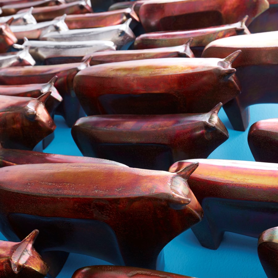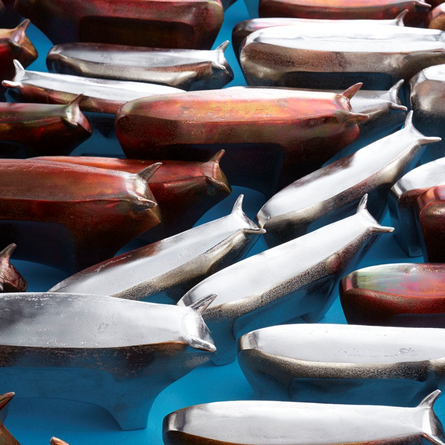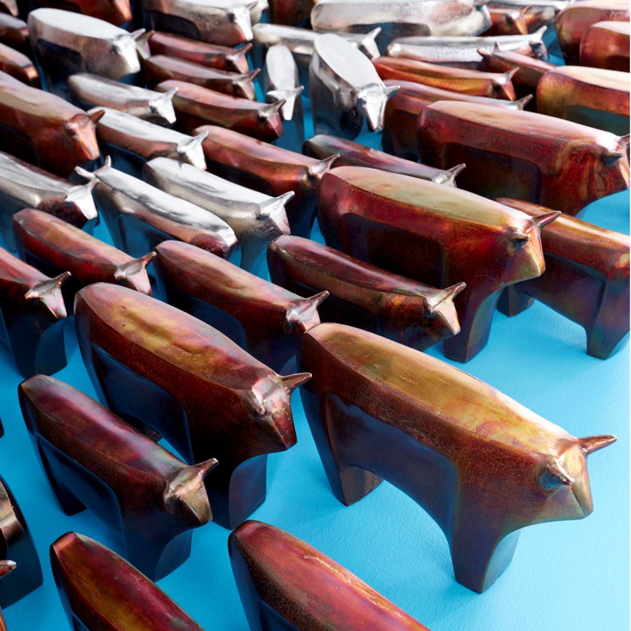 Glossy smooth lines hint at rural rolling hills teeming with oxen with this bovine sculpture. Shimmering burnished copper gives this lightweight piece a touch of antiquity.