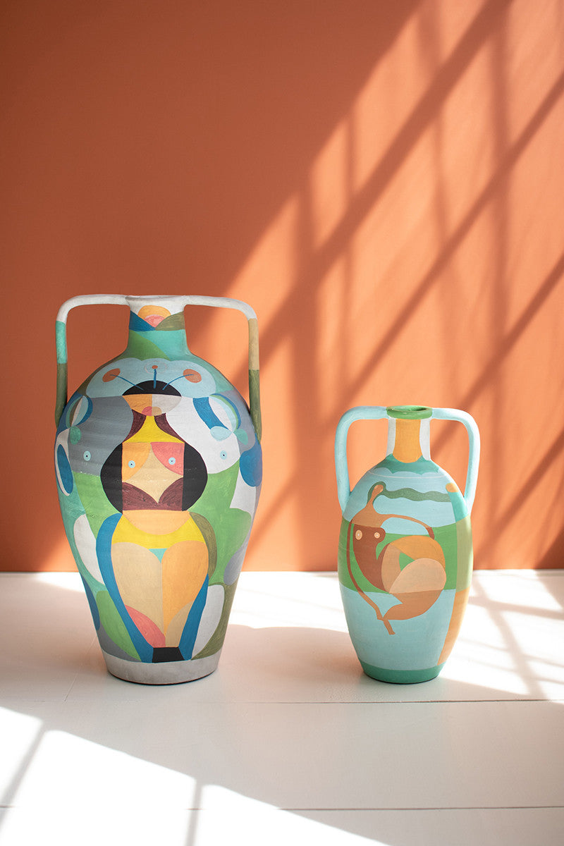 Small ceramic multi-colored urn with two handles