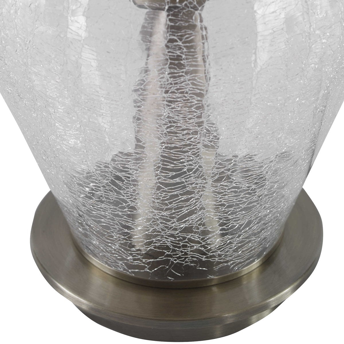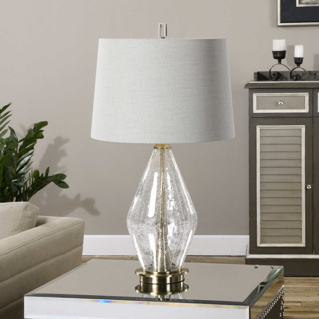 Clear Crackled Glass Base Accented With Plated Brushed Brass Details. The Tapered Round Hardback Shade Is A Light Gray Linen Fabric.
