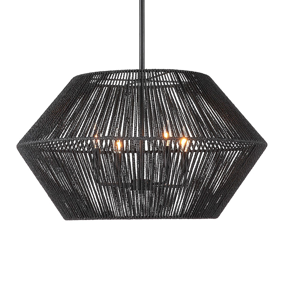 Natural Rope Is Hand Wrapped And Dyed A Chic Black To Form The Shade Of Our 4 Lt Pendant Giving Both An Adventurous & Dressed Up Feel In Matte Black. 4-60 Watt Max Candelabra Sockets. Bulbs Not Included. Supplied With 15' Wire, 3-12" Stems And 1-6" Stem For Adjustable Installation.