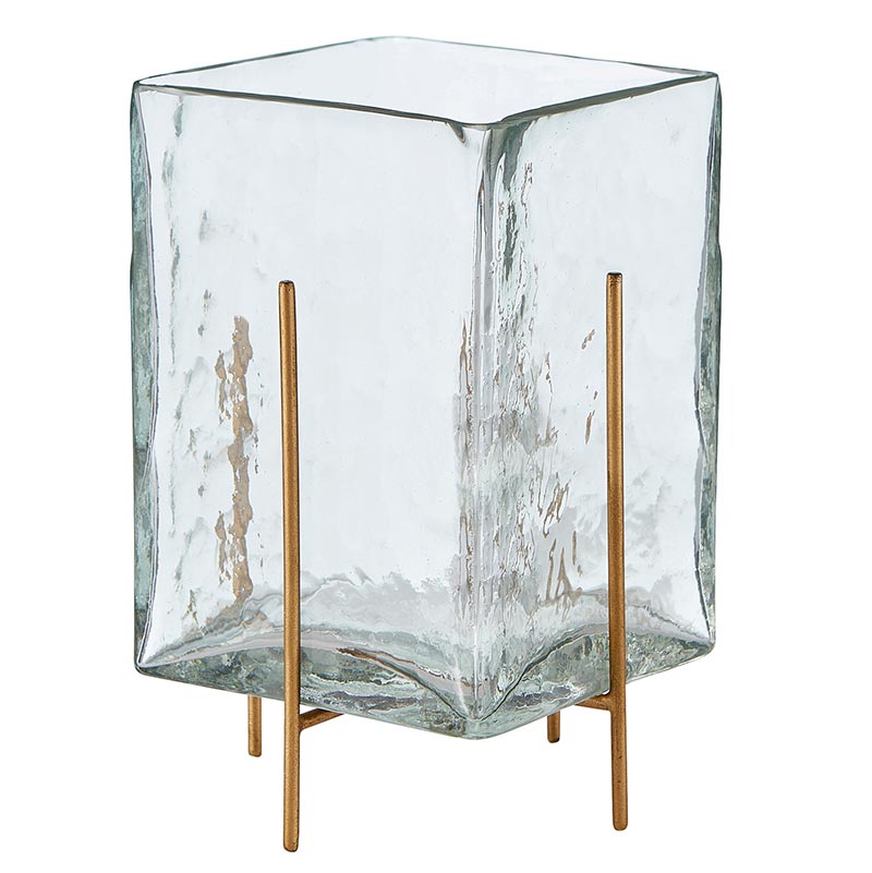 This beautifully made glass tea light holder is elevated with a customized metal riser and adds sophisticated charm to any interior.