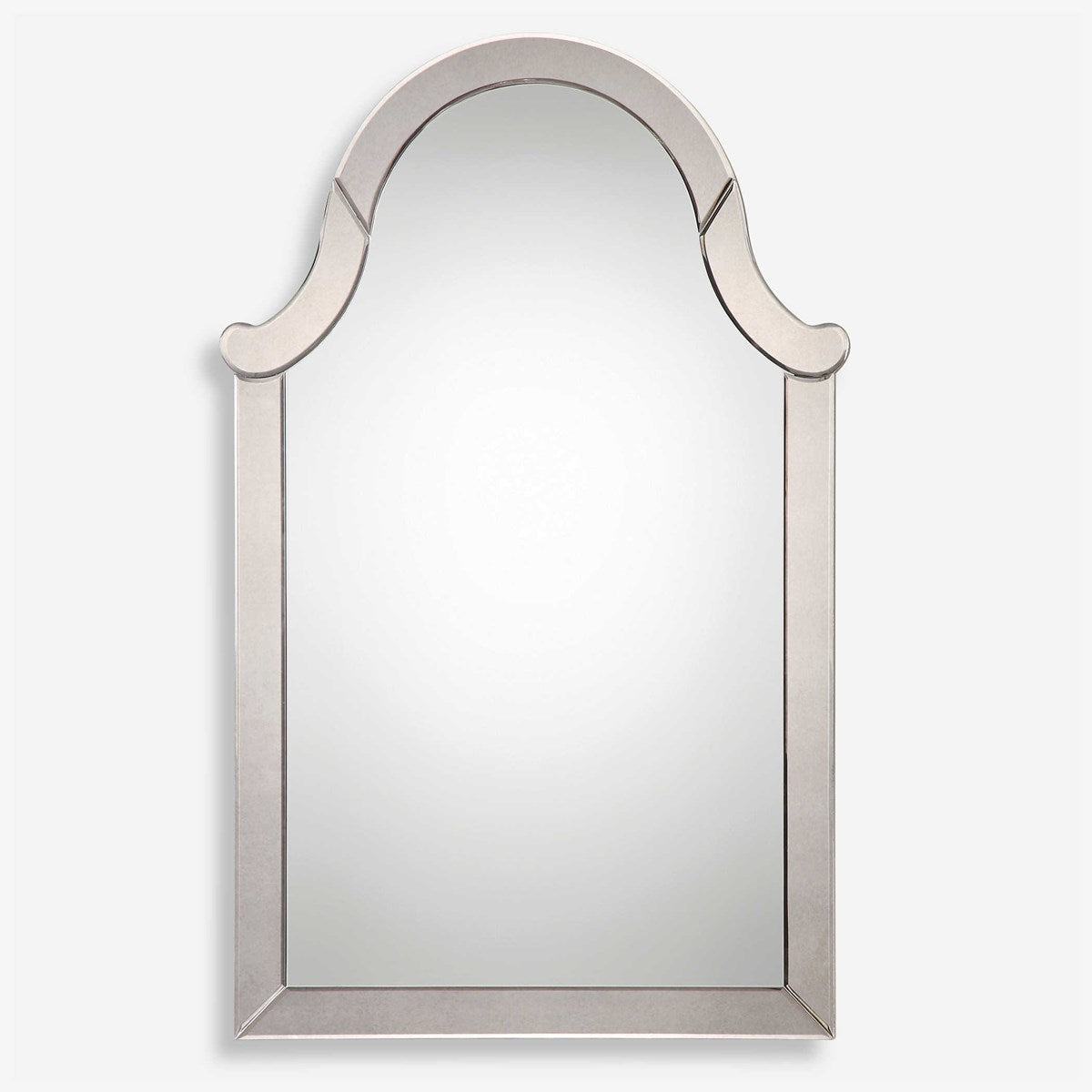This Frameless Mirror Featuring Hand Beveled Side Mirrors, Displays An Impressive Arch Top.