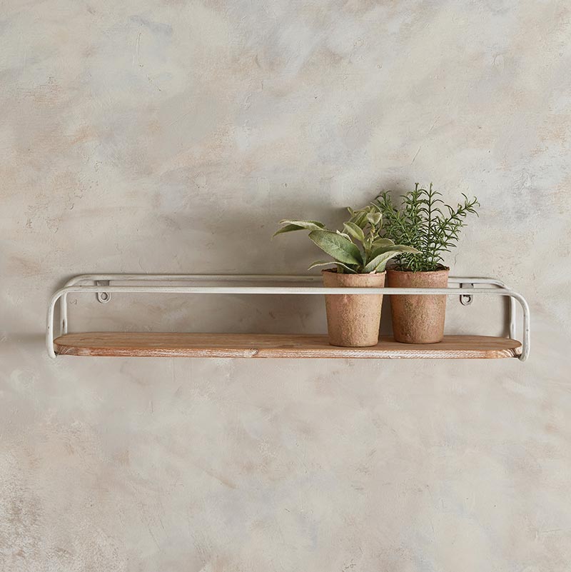 Show off your decorative items with this charming iron and wood shelf.